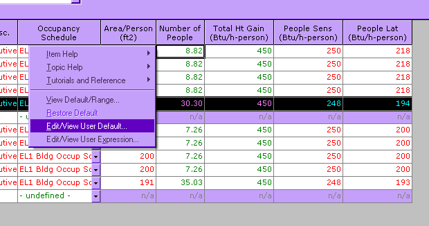 4. Voila! All inputs for that field which are defaulted (not red) will change blue, to indicate a non-library default is being used. You can copy (ctrl+c) and paste (ctrl+v) green or blue cells to return defined (red) fields to default (green/blue/violet):